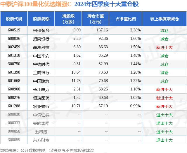 证券之星消息,日前中泰沪深300量化优选增强C基金公布四季报,2024年四季度最新规模0.22亿元,季度净值涨幅为-3.25%。