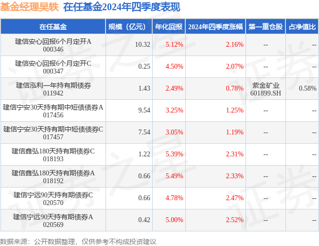 证券之星消息,日前建信泓利一年持有期债券基金公布四季报,2024年四季度最新规模1.43亿元,季度净值涨幅为0.78%。