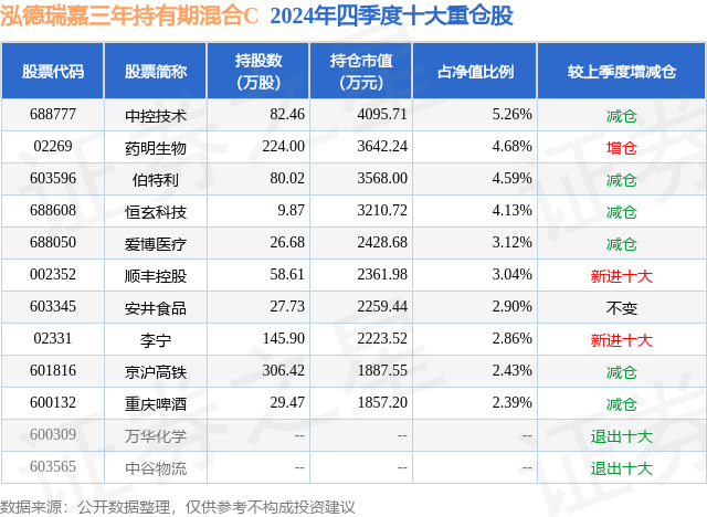 从基金规模来看,泓德瑞嘉三年持有期混合C基金2024年四季度公布的基金规模为0.45亿元,较上一期规模4826.51万元变化了-330.07万元,环比变化了-6.84%。该基金最新一期资产配置为:股票占净值比80.8%,债券占净值比2.66%,现金占净值比17.04%。从基金持仓来看,该基金当季前十大股票仓位达35.4%,第一大重仓股为中控技术(688777),持仓占比为5.26%。