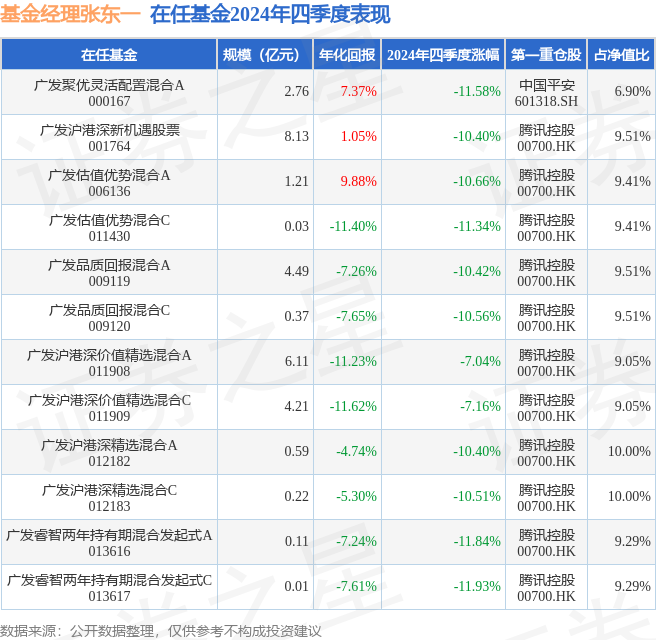 广发沪港深价值精选混合C现任基金经理为张东一。其中在任基金经理张东一已从业8年又183天,2021年5月25日正式接手管理广发沪港深价值精选混合C,任职期间累计回报为-36.4%。目前还管理着12只基金产品(包括A类和C类)。