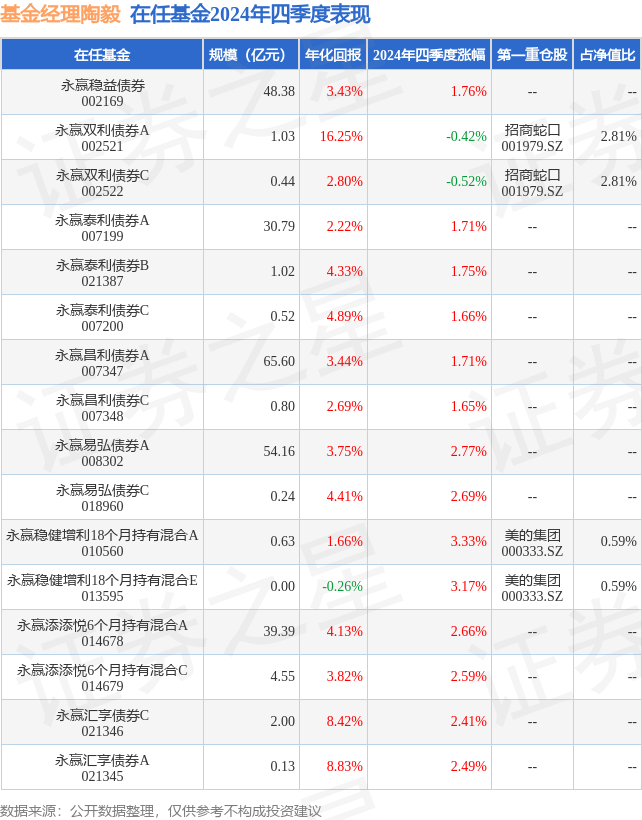 永赢稳健增利18个月持有混合E现任基金经理为陶毅。其中在任基金经理陶毅已从业4年又258天,2021年9月15日正式接手管理永赢稳健增利18个月持有混合E,任职期间累计回报为-0.87%。目前还管理着16只基金产品(包括A类和C类),其中本季度表现最佳的基金为永赢稳健增利18个月持有混合A(010560),季度净值涨幅为3.33%。