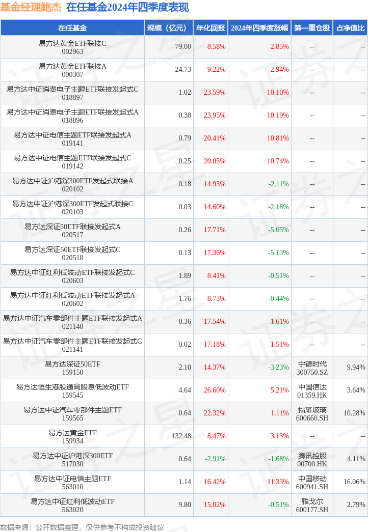 易方达中证沪港深300ETF现任基金经理为鲍杰。其中在任基金经理鲍杰已从业2年又48天,2022年12月10日正式接手管理易方达中证沪港深300ETF,任职期间累计回报为4.21%。目前还管理着21只基金产品(包括A类和C类),其中本季度表现最佳的基金为易方达中证电信主题ETF(563010),季度净值涨幅为11.33%。