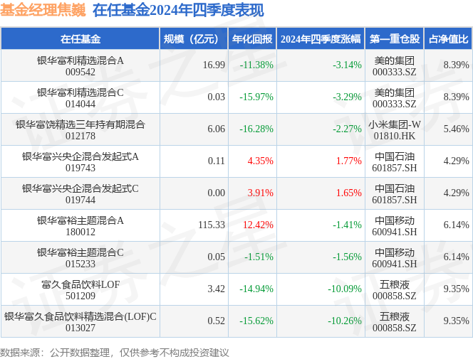 银华富饶精选三年持有期混合现任基金经理为焦巍。其中在任基金经理焦巍已从业9年又158天,2021年5月28日正式接手管理银华富饶精选三年持有期混合,任职期间累计回报为-47.77%。目前还管理着9只基金产品(包括A类和C类),其中本季度表现最佳的基金为银华富兴央企混合发起式A(019743),季度净值涨幅为1.77%。