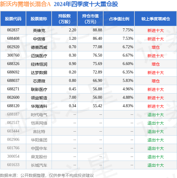 从基金规模来看,新沃内需增长混合A基金2024年四季度公布的基金规模为0.1亿元,较上一期规模1050.49万元变化了-92.45万元,环比变化了-8.8%。该基金最新一期资产配置为:股票占净值比92.66%,无债券类资产,现金占净值比7.66%。从基金持仓来看,该基金当季前十大股票仓位达62.12%,第一大重仓股为英维克(002837),持仓占比为7.75%。