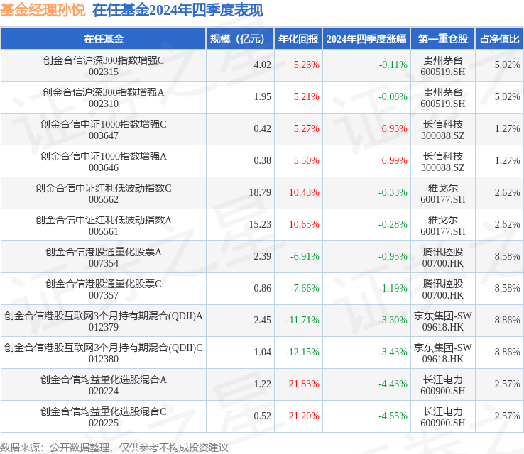 从基金规模来看,创金合信港股互联网3个月持有期混合(QDII)C基金2024年四季度公布的基金规模为1.04亿元,较上一期规模1.09亿元变化了-560.85万元,环比变化了-5.13%。该基金最新一期资产配置为:股票占净值比87.16%,无债券类资产,现金占净值比6.84%。从基金持仓来看,该基金当季前十大股票仓位达64.58%,第一大重仓股为京东集团-SW(09618),持仓占比为8.86%。