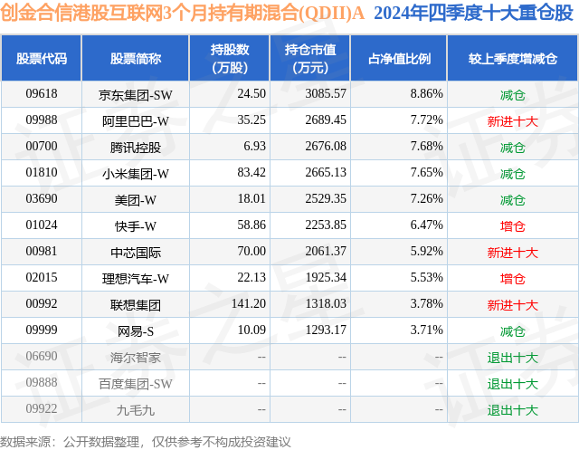 从基金规模来看,创金合信港股互联网3个月持有期混合(QDII)A基金2024年四季度公布的基金规模为2.45亿元,较上一期规模2.67亿元变化了-2206.25万元,环比变化了-8.28%。该基金最新一期资产配置为:股票占净值比87.16%,无债券类资产,现金占净值比6.84%。从基金持仓来看,该基金当季前十大股票仓位达64.58%,第一大重仓股为京东集团-SW(09618),持仓占比为8.86%。