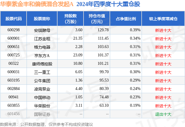 从基金规模来看,华泰紫金丰和偏债混合发起A基金2024年四季度公布的基金规模为0.26亿元,较上一期规模1106.48万元变化了1535.06万元,环比变化了138.73%。该基金最新一期资产配置为:股票占净值比4.48%,债券占净值比81.23%,现金占净值比2.19%。从基金持仓来看,该基金当季前十大股票仓位达2.91%,第一大重仓股为安琪酵母(600298),持仓占比为0.39%。