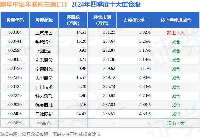 证券之星消息,日前鹏华中证车联网主题ETF基金公布四季报,2024年四季度最新规模0.51亿元,季度净值涨幅为4.93%。