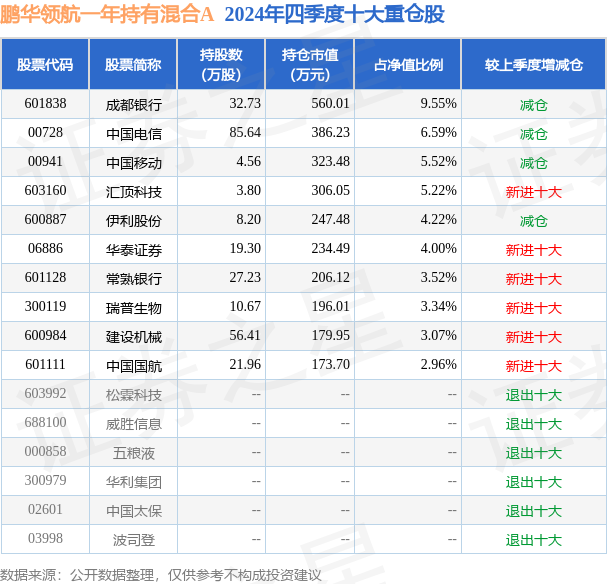 从基金规模来看,鹏华领航一年持有混合A基金2024年四季度公布的基金规模为0.34亿元,较上一期规模5326.82万元变化了-1887.94万元,环比变化了-35.44%。该基金最新一期资产配置为:股票占净值比82.77%,无债券类资产,现金占净值比8.93%。从基金持仓来看,该基金当季前十大股票仓位达47.99%,第一大重仓股为成都银行(601838),持仓占比为9.55%。
