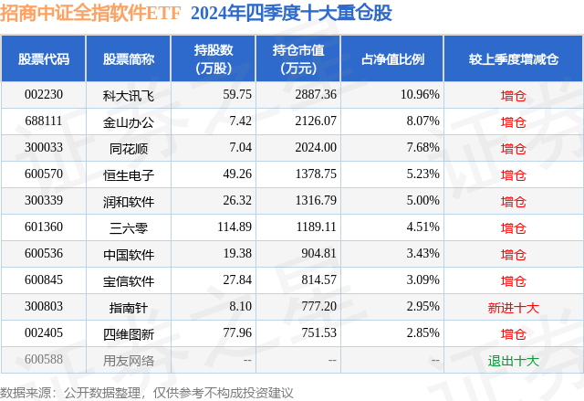 从基金规模来看,招商中证全指软件ETF基金2024年四季度公布的基金规模为2.63亿元,较上一期规模2.07亿元变化了5616.57万元,环比变化了27.1%。该基金最新一期资产配置为:股票占净值比99.05%,无债券类资产,现金占净值比0.8%。从基金持仓来看,该基金当季前十大股票仓位达53.77%,第一大重仓股为科大讯飞(002230),持仓占比为10.96%。
