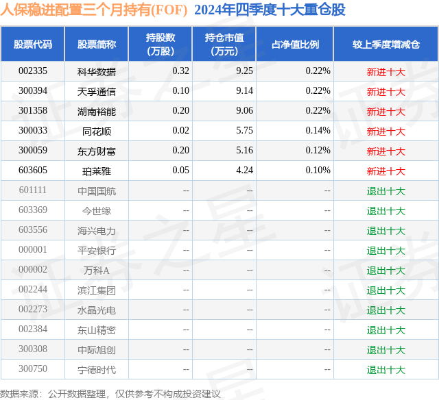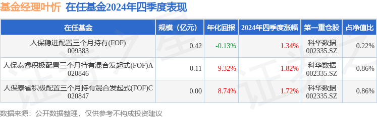从基金规模来看,人保稳进配置三个月持有(FOF)基金2024年四季度公布的基金规模为0.42亿元,较上一期规模5228.48万元变化了-1060.54万元,环比变化了-20.28%。该基金最新一期资产配置为:股票占净值比1.02%,债券占净值比5.57%,现金占净值比0.87%。从基金持仓来看,该基金当季前十大股票仓位达1.02%,第一大重仓股为科华数据(002335),持仓占比为0.22%。