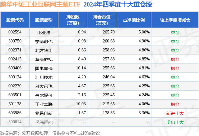从基金规模来看,鹏华中证工业互联网主题ETF基金2024年四季度公布的基金规模为0.53亿元,较上一期规模5359.61万元变化了-45.01万元,环比变化了-0.84%。该基金最新一期资产配置为:股票占净值比98.79%,无债券类资产,现金占净值比1.49%。从基金持仓来看,该基金当季前十大股票仓位达44.96%,第一大重仓股为比亚迪(002594),持仓占比为5.0%。