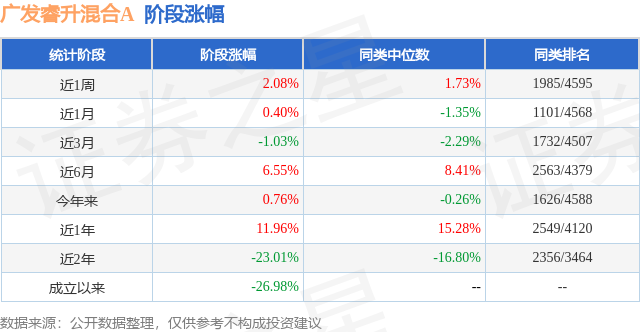 从业绩表现来看,广发睿升混合A基金过去一年净值涨幅为11.96%,在同类基金中排名2549/4120,同类基金过去一年净值涨幅中位数为15.28%。而基金过去一年的最大回撤为-12.08%,成立以来的最大回撤为-42.2%。