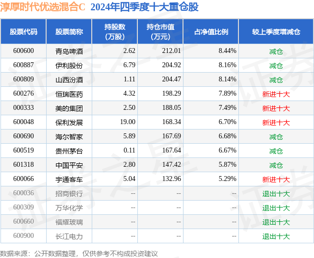 从基金规模来看,淳厚时代优选混合C基金2024年四季度公布的基金规模为0.02亿元,较上一期规模4928.74万元变化了-4683.82万元,环比变化了-95.03%。该基金最新一期资产配置为:股票占净值比94.65%,无债券类资产,现金占净值比99.23%。从基金持仓来看,该基金当季前十大股票仓位达71.33%,第一大重仓股为青岛啤酒(600600),持仓占比为8.44%。