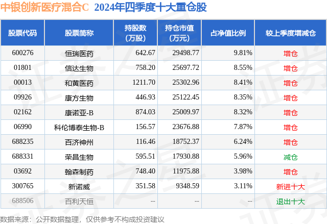从基金规模来看,中银创新医疗混合C基金2024年四季度公布的基金规模为9.87亿元,较上一期规模8.52亿元变化了1.35亿元,环比变化了15.86%。该基金最新一期资产配置为:股票占净值比93.85%,债券占净值比5.41%,现金占净值比1.82%。从基金持仓来看,该基金当季前十大股票仓位达70.6%,第一大重仓股为恒瑞医药(600276),持仓占比为9.81%。