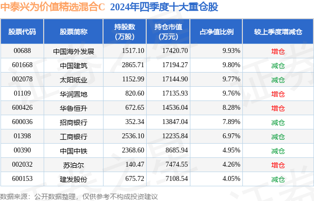 从基金规模来看,中泰兴为价值精选混合C基金2024年四季度公布的基金规模为6.44亿元,较上一期规模7.88亿元变化了-1.43亿元,环比变化了-18.22%。该基金最新一期资产配置为:股票占净值比92.33%,无债券类资产,现金占净值比8.23%。从基金持仓来看,该基金当季前十大股票仓位达75.66%,第一大重仓股为中国海外发展(00688),持仓占比为9.93%。