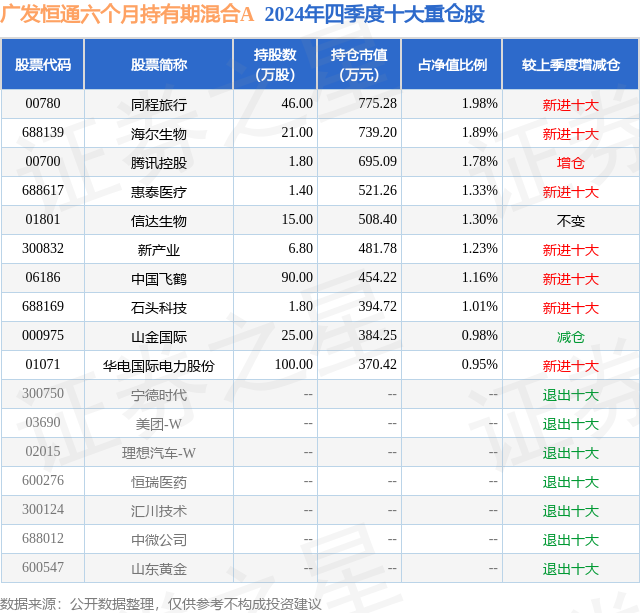从基金规模来看,广发恒通六个月持有期混合A基金2024年四季度公布的基金规模为3.32亿元,较上一期规模4.39亿元变化了-1.07亿元,环比变化了-24.42%。该基金最新一期资产配置为:股票占净值比28.91%,债券占净值比68.15%,现金占净值比1.56%。从基金持仓来看,该基金当季前十大股票仓位达13.61%,第一大重仓股为同程旅行(00780),持仓占比为1.98%。