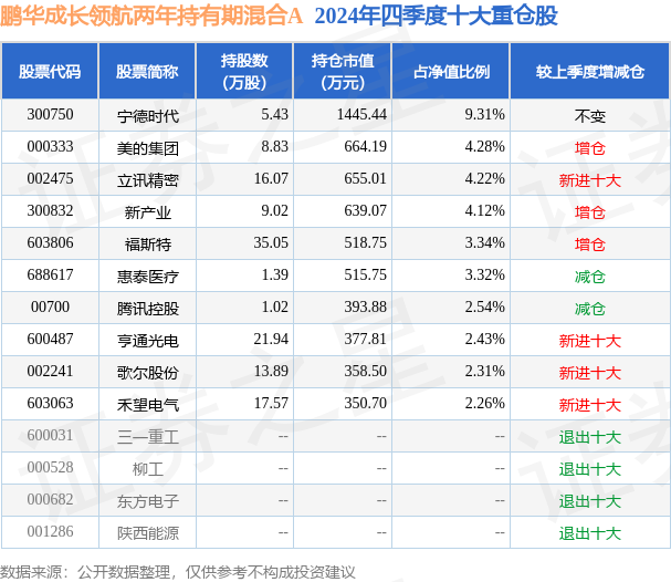 对本季度基金运作,基金经理的观点如下:四季度,我们减仓了电力,加仓了消费电子。我们认为在国内消费补贴的刺激下,消费电子行业的需求会有所恢复,叠加AI带来的产品创新周期,产业链中部分环节的价值量会有大幅提升。我们对2025年整体还是比较积极,信心趋势的改变可能需要量变累积到一定程度后才能带来质变。2025年我们认为要花比较多的研究精力在内需上,尤其要关注技术和产品层面有变化和迭代的公司。