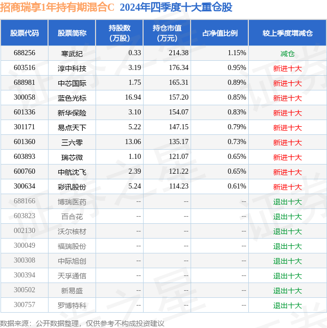 证券之星消息,日前招商瑞享1年持有期混合C基金公布四季报,2024年四季度最新规模0.3亿元,季度净值涨幅为3.99%。