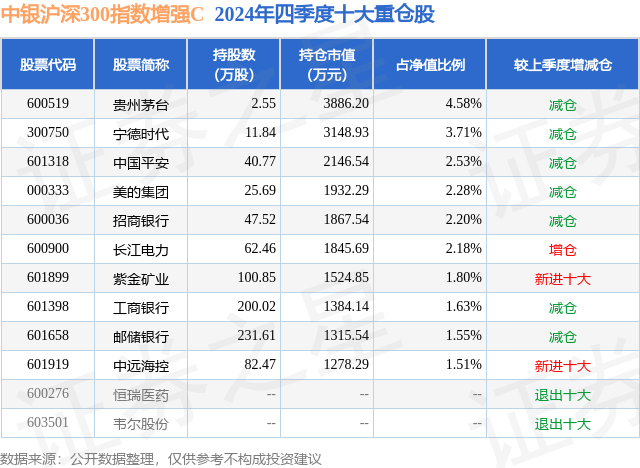 从基金规模来看,中银沪深300指数增强C基金2024年四季度公布的基金规模为3.41亿元,较上一期规模5.8亿元变化了-2.4亿元,环比变化了-41.27%。该基金最新一期资产配置为:股票占净值比93.09%,无债券类资产,现金占净值比18.3%。从基金持仓来看,该基金当季前十大股票仓位达23.97%,第一大重仓股为贵州茅台(600519),持仓占比为4.58%。