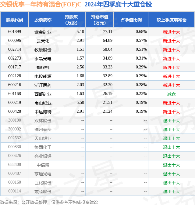 从基金规模来看,交银优享一年持有混合(FOF)C基金2024年四季度公布的基金规模为0.06亿元,较上一期规模655.5万元变化了-73.15万元,环比变化了-11.16%。该基金最新一期资产配置为:股票占净值比6.92%,债券占净值比4.39%,现金占净值比1.64%。从基金持仓来看,该基金当季前十大股票仓位达3.54%,第一大重仓股为紫金矿业(601899),持仓占比为0.68%。