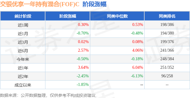 从业绩表现来看,交银优享一年持有混合(FOF)C基金过去一年净值涨幅为3.64%,在同类基金中排名251/352,同类基金过去一年净值涨幅中位数为6.04%。而基金过去一年的最大回撤为-4.71%,成立以来的最大回撤为-11.93%。