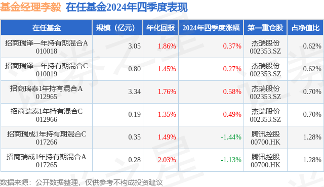 证券之星消息,日前招商瑞泽一年持有期混合A基金公布四季报,2024年四季度最新规模3.05亿元,季度净值涨幅为0.37%。