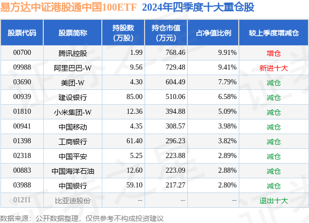 从基金规模来看,易方达中证港股通中国100ETF基金2024年四季度公布的基金规模为0.78亿元,较上一期规模7316.95万元变化了439.24万元,环比变化了6.0%。该基金最新一期资产配置为:股票占净值比97.58%,无债券类资产,现金占净值比2.57%。从基金持仓来看,该基金当季前十大股票仓位达55.15%,第一大重仓股为腾讯控股(00700),持仓占比为9.91%。