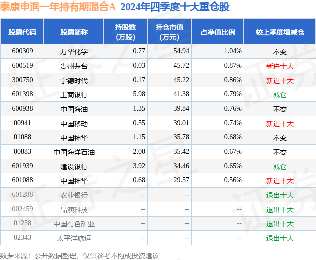 证券之星消息,日前泰康申润一年持有期混合A基金公布四季报,2024年四季度最新规模0.17亿元,季度净值涨幅为-0.12%。