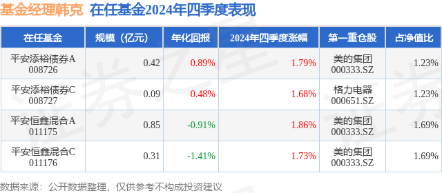 证券之星消息,日前平安添裕债券C基金公布四季报,2024年四季度最新规模0.09亿元,季度净值涨幅为1.68%。