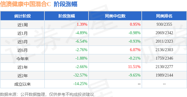 从业绩表现来看,信澳健康中国混合C基金过去一年净值涨幅为-2.66%,在同类基金中排名2130/2277,同类基金过去一年净值涨幅中位数为11.51%。而基金过去一年的最大回撤为-20.5%,成立以来的最大回撤为-37.92%。