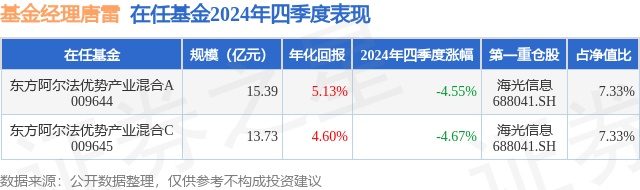 从基金规模来看,东方阿尔法优势产业混合C基金2024年四季度公布的基金规模为13.73亿元,较上一期规模17.4亿元变化了-3.67亿元,环比变化了-21.11%。该基金最新一期资产配置为:股票占净值比94.55%,债券占净值比6.93%,现金占净值比1.9%。从基金持仓来看,该基金当季前十大股票仓位达53.46%,第一大重仓股为海光信息(688041),持仓占比为7.33%。