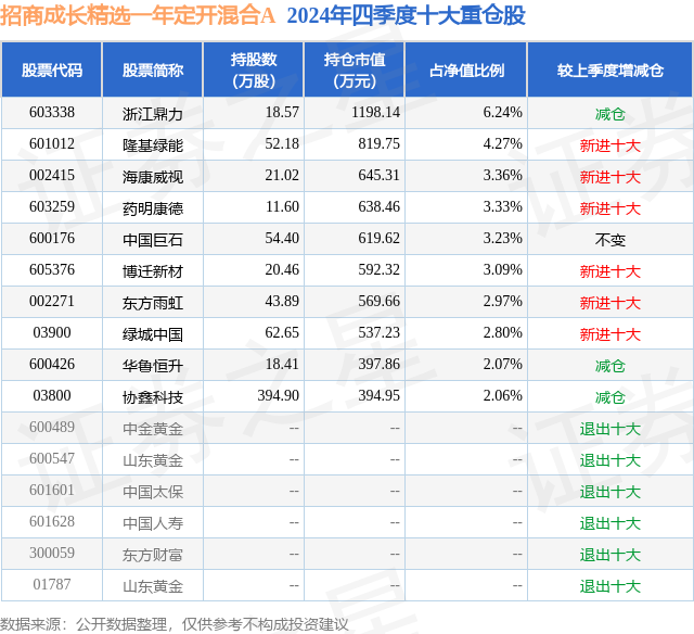 从基金规模来看,招商成长精选一年定开混合A基金2024年四季度公布的基金规模为1.44亿元,较上一期规模1.56亿元变化了-1147.65万元,环比变化了-7.36%。该基金最新一期资产配置为:股票占净值比82.81%,无债券类资产,现金占净值比13.51%。从基金持仓来看,该基金当季前十大股票仓位达33.42%,第一大重仓股为浙江鼎力(603338),持仓占比为6.24%。