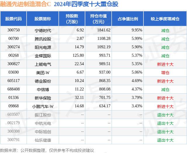从基金规模来看,融通先进制造混合C基金2024年四季度公布的基金规模为0.12亿元,较上一期规模1482.86万元变化了-261.01万元,环比变化了-17.6%。该基金最新一期资产配置为:股票占净值比84.86%,无债券类资产,现金占净值比10.65%。从基金持仓来看,该基金当季前十大股票仓位达53.9%,第一大重仓股为宁德时代(300750),持仓占比为9.95%。