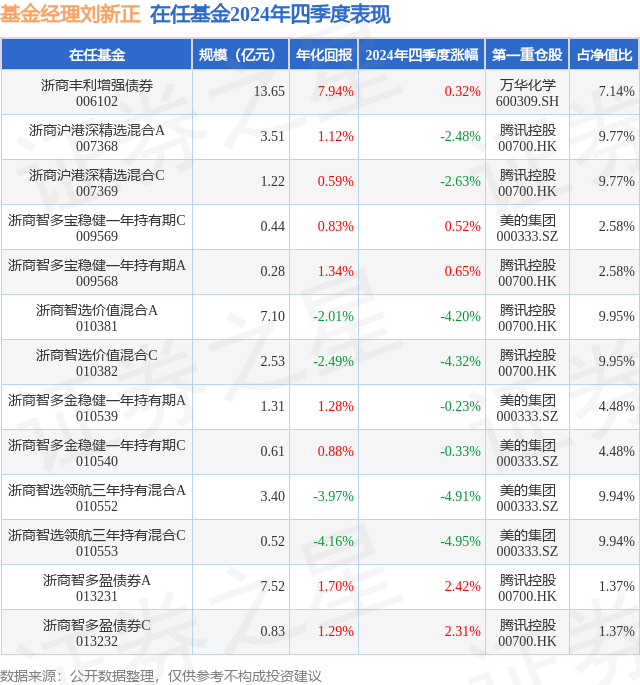 从基金规模来看,浙商智多宝稳健一年持有期C基金2024年四季度公布的基金规模为0.44亿元,较上一期规模4950.75万元变化了-593.31万元,环比变化了-11.98%。该基金最新一期资产配置为:股票占净值比22.16%,债券占净值比75.79%,现金占净值比1.04%。从基金持仓来看,该基金当季前十大股票仓位达17.59%,第一大重仓股为腾讯控股(00700),持仓占比为2.58%。