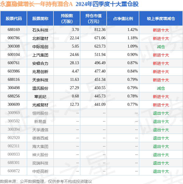 从基金规模来看,永赢稳健增长一年持有混合A基金2024年四季度公布的基金规模为1.82亿元,较上一期规模2.13亿元变化了-3144.7万元,环比变化了-14.77%。该基金最新一期资产配置为:股票占净值比24.09%,债券占净值比81.48%,现金占净值比1.39%。从基金持仓来看,该基金当季前十大股票仓位达9.43%,第一大重仓股为石头科技(688169),持仓占比为1.42%。