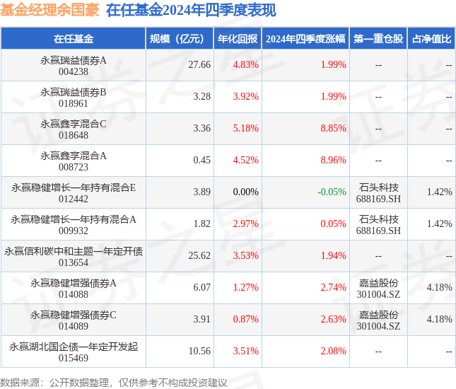 永赢稳健增长一年持有混合A现任基金经理为余国豪 沈平虹。其中在任基金经理余国豪已从业2年又154天,2025年1月10日正式接手管理永赢稳健增长一年持有混合A,任职期间累计回报为0.52%。目前还管理着10只基金产品(包括A类和C类),其中本季度表现最佳的基金为永赢鑫享混合A(008723),季度净值涨幅为8.96%。