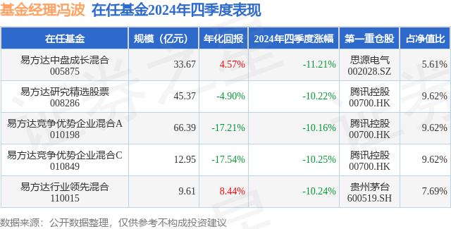 证券之星消息,日前易方达竞争优势企业混合C基金公布四季报,2024年四季度最新规模12.95亿元,季度净值涨幅为-10.25%。