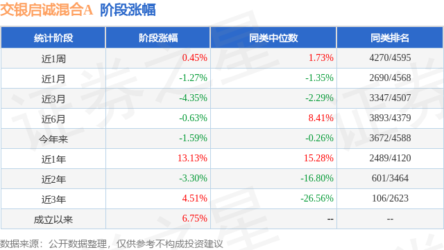 从业绩表现来看,交银启诚混合A基金过去一年净值涨幅为13.13%,在同类基金中排名2489/4120,同类基金过去一年净值涨幅中位数为15.28%。而基金过去一年的最大回撤为-18.51%,成立以来的最大回撤为-18.51%。