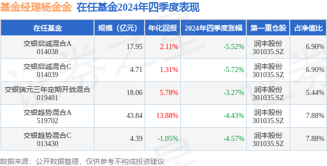 证券之星消息,日前交银启诚混合A基金公布四季报,2024年四季度最新规模17.95亿元,季度净值涨幅为-5.52%。
