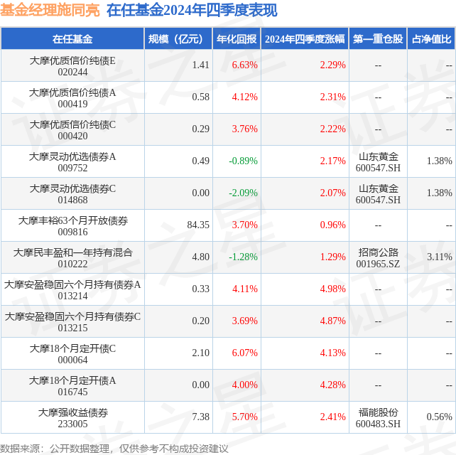 大摩民丰盈和一年持有混合现任基金经理为施同亮。其中在任基金经理施同亮已从业8年又16天,2022年8月2日正式接手管理大摩民丰盈和一年持有混合,任职期间累计回报为-4.36%。目前还管理着12只基金产品(包括A类和C类),其中本季度表现最佳的基金为大摩安盈稳固六个月持有债券A(013214),季度净值涨幅为4.98%。
