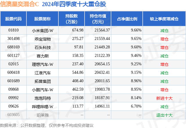 从基金规模来看,信澳星奕混合C基金2024年四季度公布的基金规模为4.76亿元,较上一期规模4.55亿元变化了2166.06万元,环比变化了4.76%。该基金最新一期资产配置为:股票占净值比92.5%,无债券类资产,现金占净值比6.88%。从基金持仓来看,该基金当季前十大股票仓位达89.52%,第一大重仓股为小米集团-W(01810),持仓占比为9.66%。