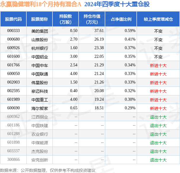 证券之星消息,日前永赢稳健增利18个月持有混合A基金公布四季报,2024年四季度最新规模0.63亿元,季度净值涨幅为3.33%。