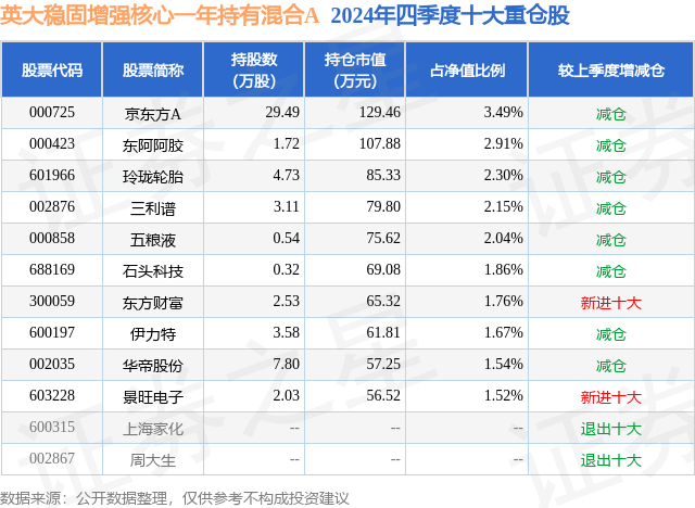证券之星消息,日前英大稳固增强核心一年持有混合A基金公布四季报,2024年四季度最新规模0.12亿元,季度净值涨幅为-0.58%。