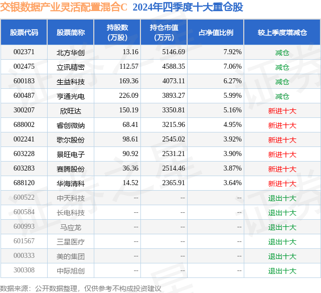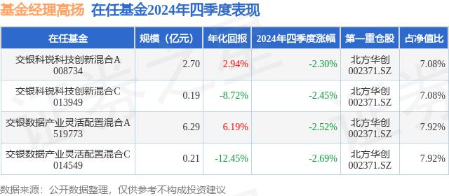 从基金规模来看,交银数据产业灵活配置混合C基金2024年四季度公布的基金规模为0.21亿元,较上一期规模4.0亿元变化了-3.79亿元,环比变化了-94.68%。该基金最新一期资产配置为:股票占净值比83.38%,债券占净值比9.35%,现金占净值比7.95%。从基金持仓来看,该基金当季前十大股票仓位达52.68%,第一大重仓股为北方华创(002371),持仓占比为7.92%。