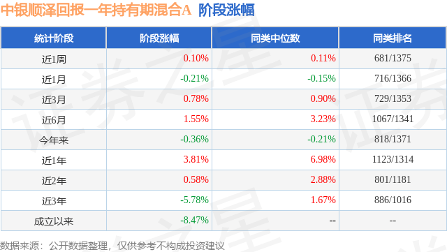 从业绩表现来看,中银顺泽回报一年持有期混合A基金过去一年净值涨幅为3.81%,在同类基金中排名1123/1314,同类基金过去一年净值涨幅中位数为6.98%。而基金过去一年的最大回撤为-2.35%,成立以来的最大回撤为-12.79%。