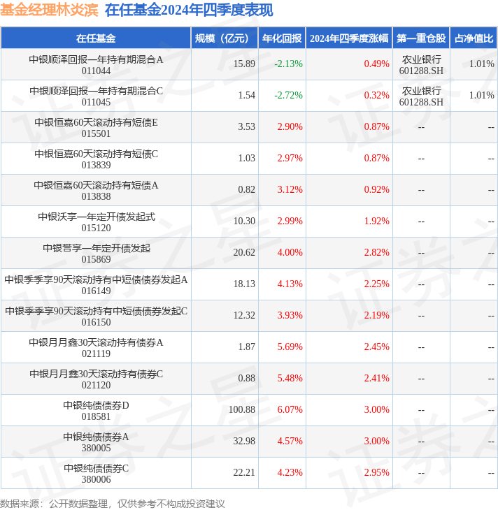 证券之星消息,日前中银顺泽回报一年持有期混合A基金公布四季报,2024年四季度最新规模15.89亿元,季度净值涨幅为0.49%。