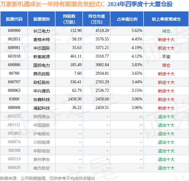 从基金规模来看,万家新机遇成长一年持有期混合发起式C基金2024年四季度公布的基金规模为1.61亿元,较上一期规模1.99亿元变化了-3867.43万元,环比变化了-19.41%。该基金最新一期资产配置为:股票占净值比77.48%,无债券类资产,现金占净值比23.2%。从基金持仓来看,该基金当季前十大股票仓位达38.57%,第一大重仓股为长江电力(600900),持仓占比为5.62%。