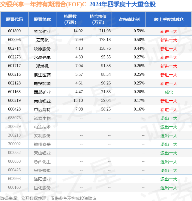 从基金规模来看,交银兴享一年持有期混合(FOF)C基金2024年四季度公布的基金规模为1.27亿元,较上一期规模1.39亿元变化了-1186.3万元,环比变化了-8.52%。该基金最新一期资产配置为:股票占净值比6.17%,债券占净值比5.24%,现金占净值比0.65%。从基金持仓来看,该基金当季前十大股票仓位达3.09%,第一大重仓股为紫金矿业(601899),持仓占比为0.59%。