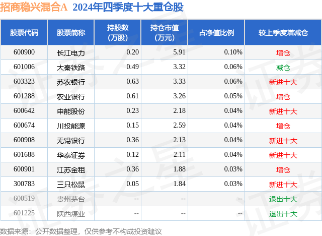 证券之星消息,日前招商稳兴混合A基金公布四季报,2024年四季度最新规模0.18亿元,季度净值涨幅为0.69%。